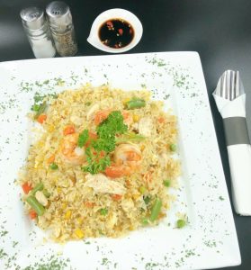 Flavored Jasmine Rice, Chicken, shrimps, Pineapple, eggs, onions, bell peppers, cashew nut ...