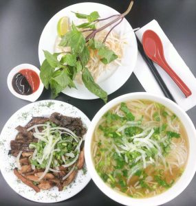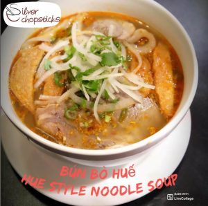 Spicy Vietnamese beef noodle soup comes with beef shank, pork hock, Vietnamese sausages, ...